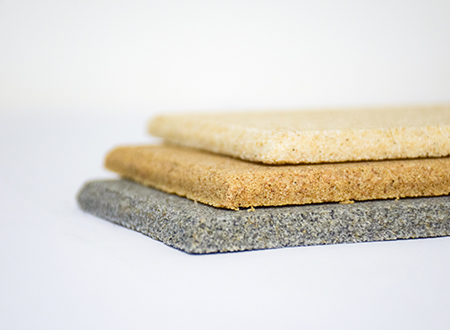 微粒材料是一種新型綠色裝飾材料,具備優異的聲學性和物理性能。該材料是以天然砂?;蚪洯h保處理的固廢顆粒為骨料,以環保膠凝劑,通過壓振工藝,生產的具有大量相互連通的微小空隙的多孔材料。